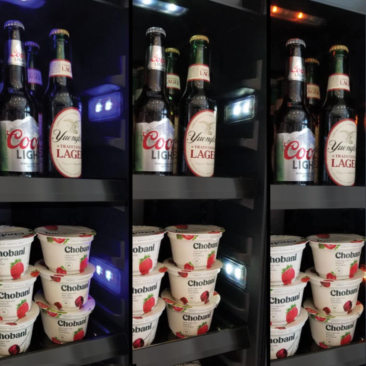 Cool running LEDS are change with the push of a button from theater white to midnight blue or honey amber.