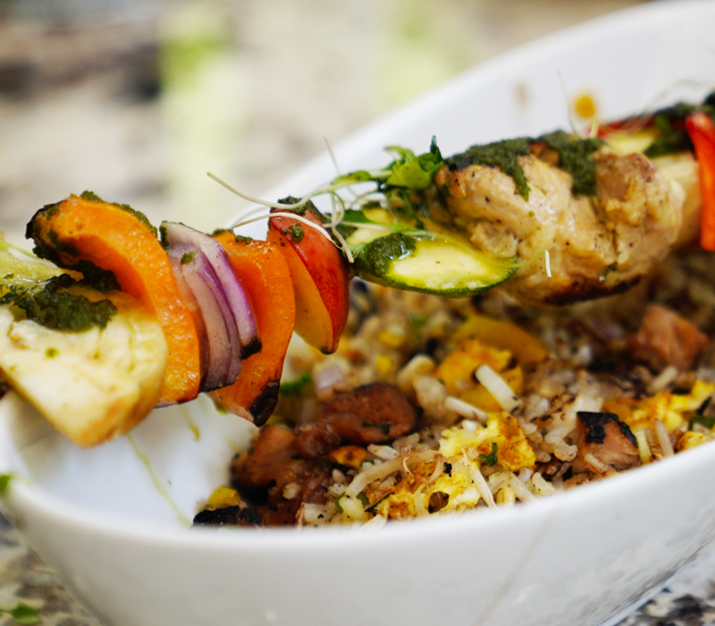 - Start with zucchini, pepper, onion, another pepper, fennel, chicken then peach.