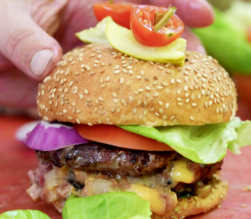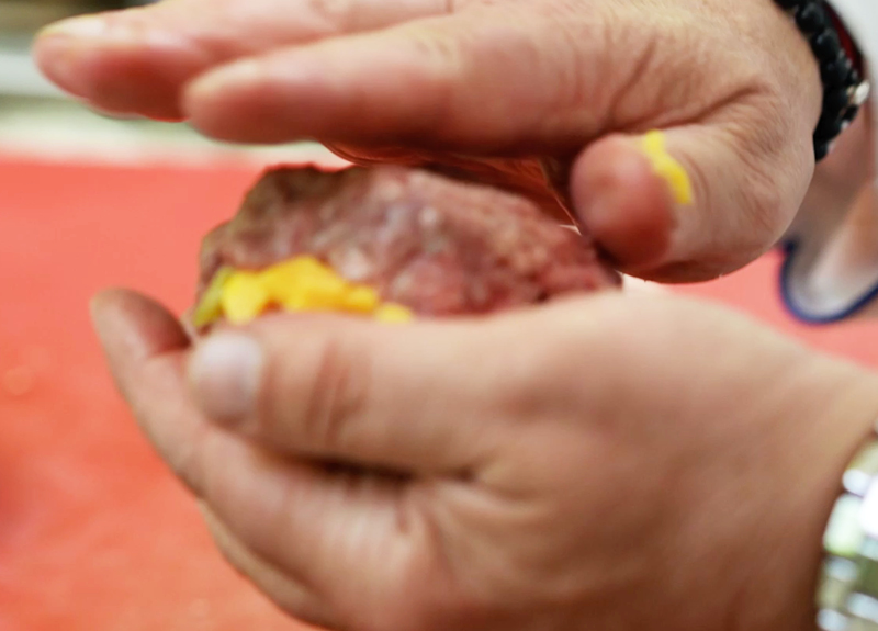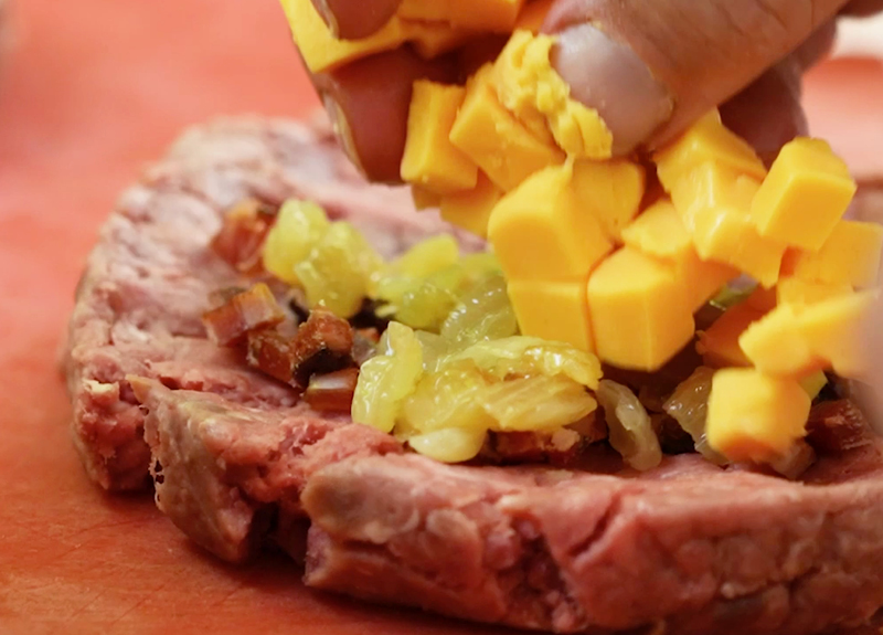 - Form 8 4oz. patties with ground beef. Top four patties with bacon/cheese mixture.