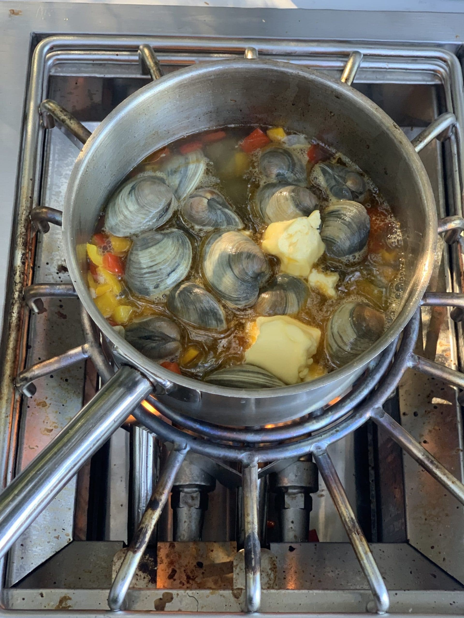 - Meanwhile, in a heavy-bottomed saucepan, heat 4 tablespoons of olive oil and sauté the garlic and peppers. Add the clams and wine and cover. Allow the clams to steam until they are open, about 5 minutes. Add the parsley last and season with salt and pepper to taste.