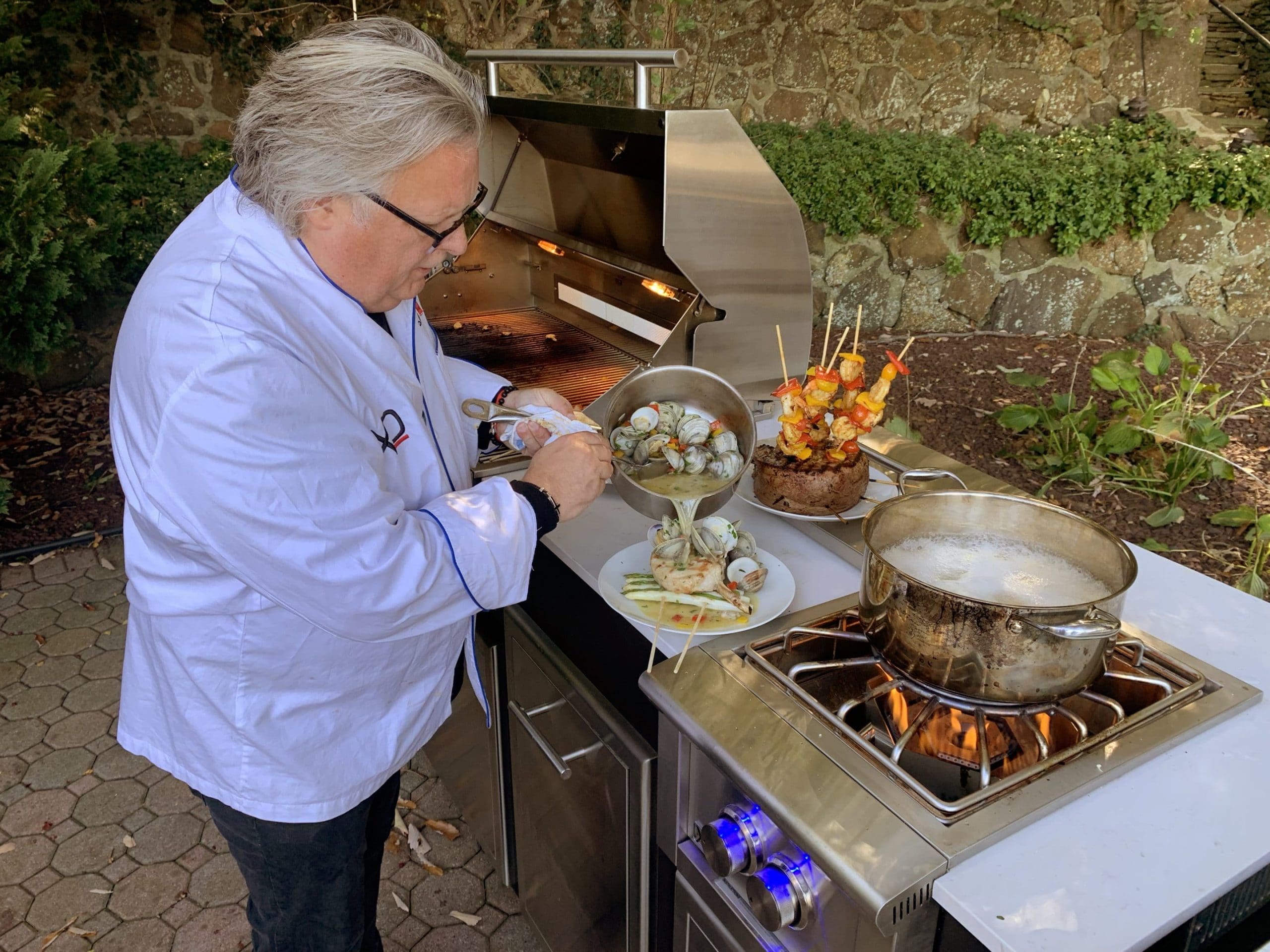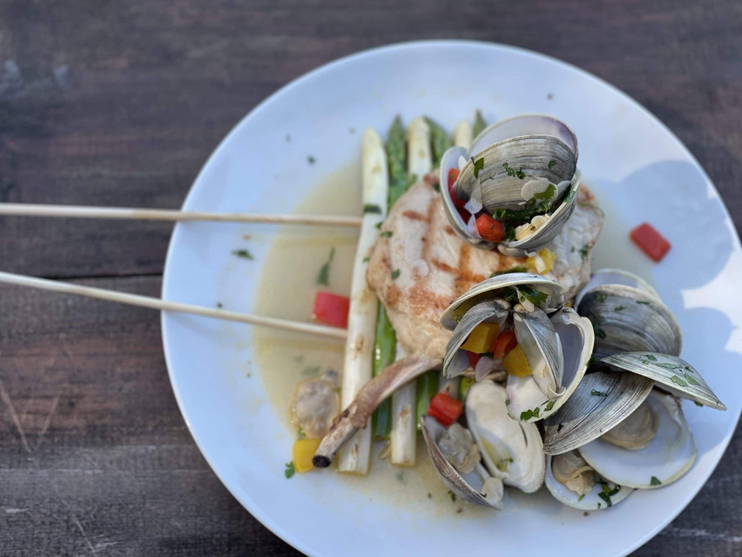 - Assemble four kebabs by skewering alternating 3 pieces of green and 3 pieces of white asparagus on each skewer. Place 2 roasted garlic cloves on the top.