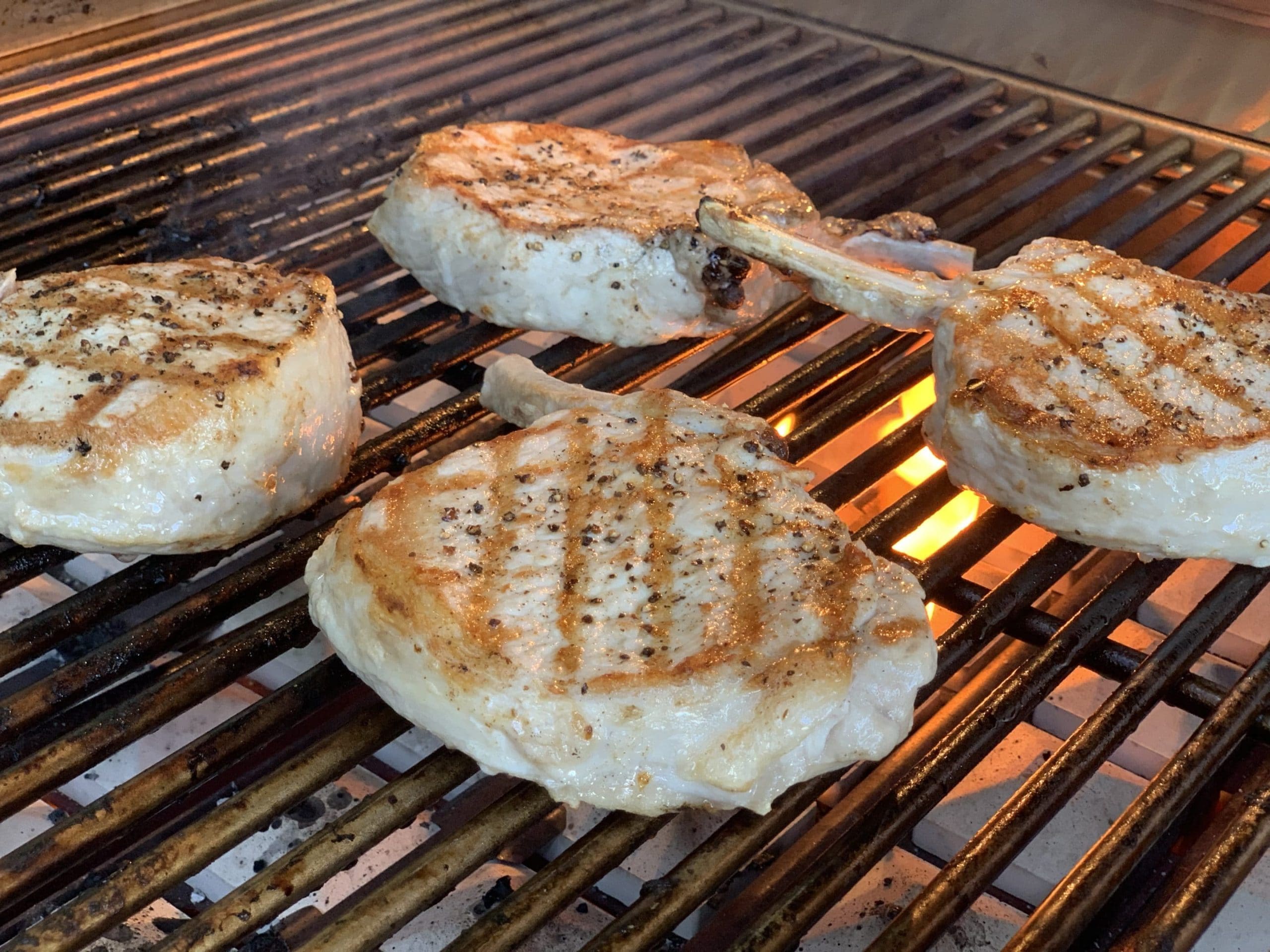 - Season the pork chops with olive oil and salt and pepper to taste. Grill for 5minutes on each side, until the internal temperature reaches 125 degrees for medium and 155 degrees for well done.
