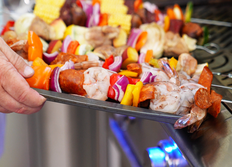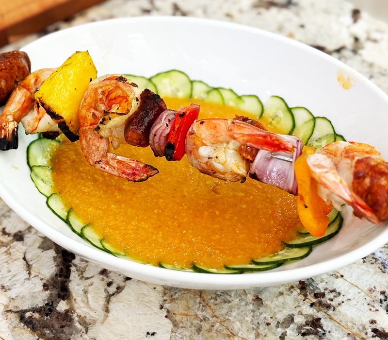 - Start with zucchini, a pepper, chorizo, shrimp, chorizo, two more pieces of pepper, then onion.