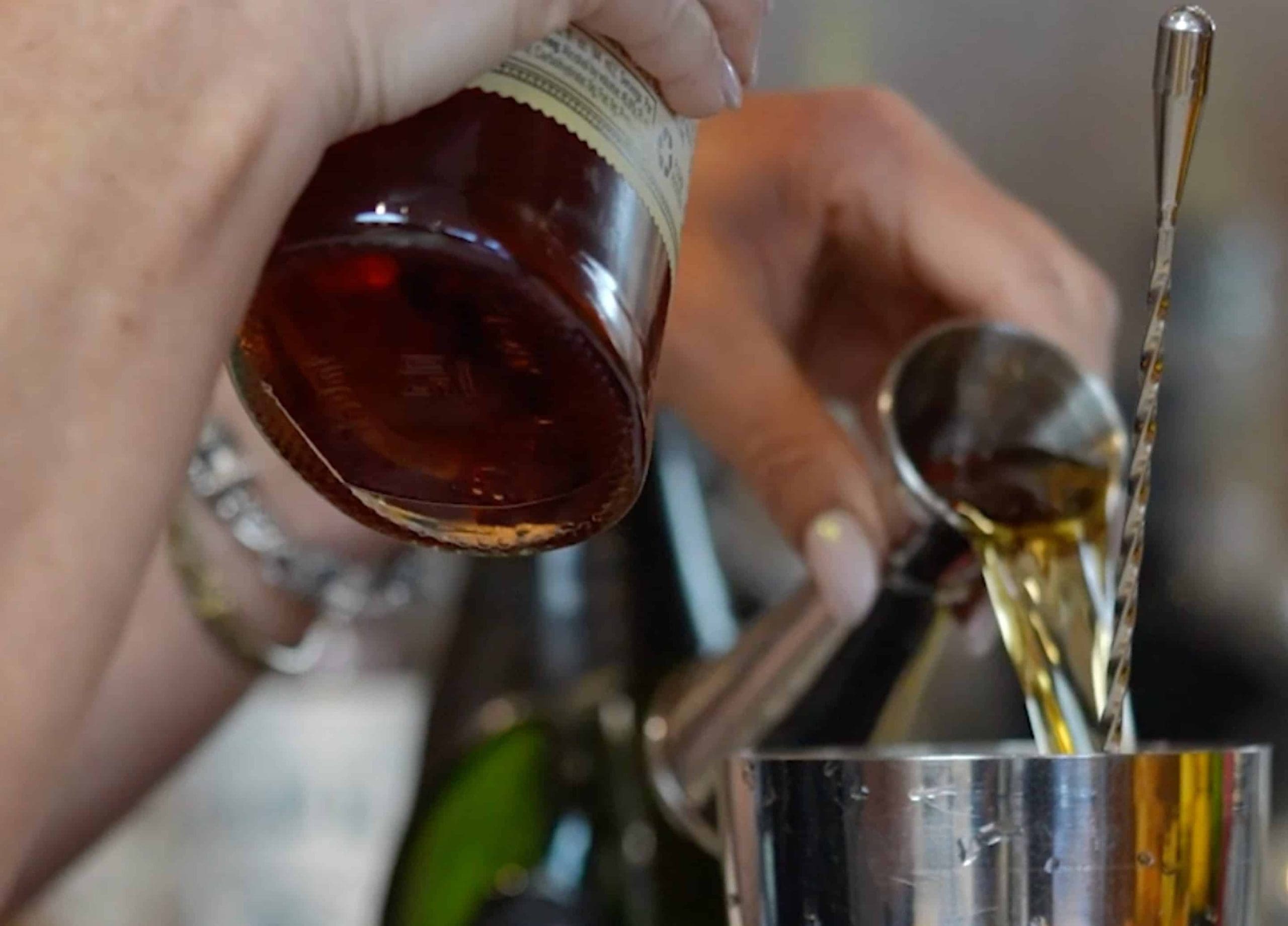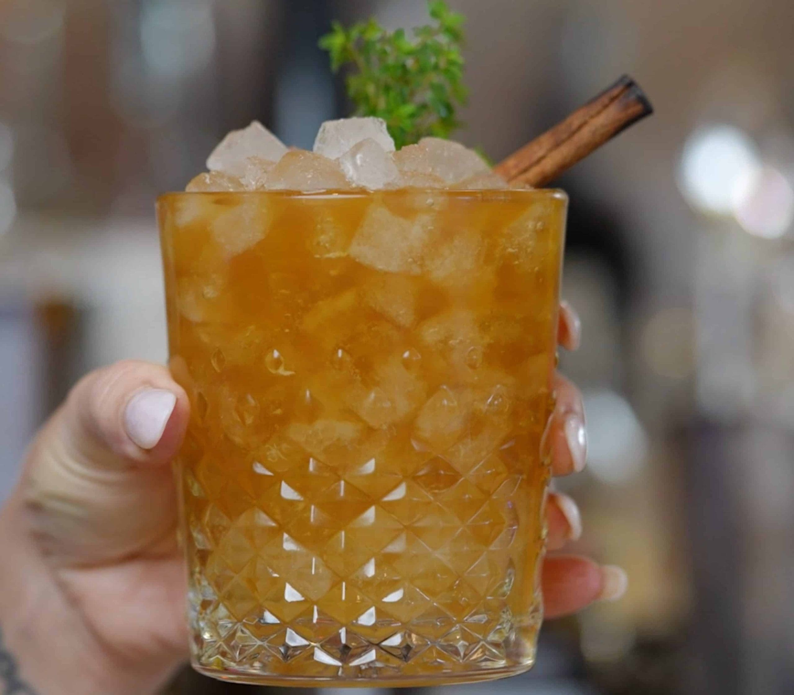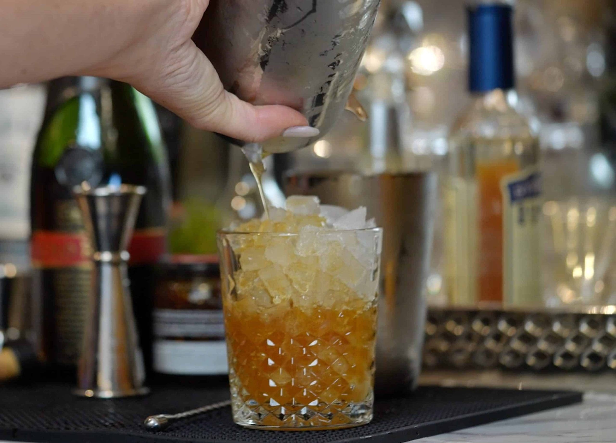 - Put XO nugget ice into rocks glass and strain liquid over it.