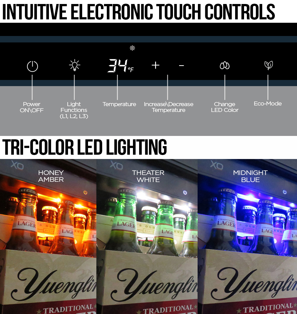 Easy to Store – Easy to Find. Your XO undercounter Beverage Center is the quick, convenient way to keep all your favorite beverages close at hand. The clear glass shelves fully extend while loaded to let you see and find everything at a glance. And because they easily adjust to 15 different positions, you can quickly configure the beverage center into your beverage center.
