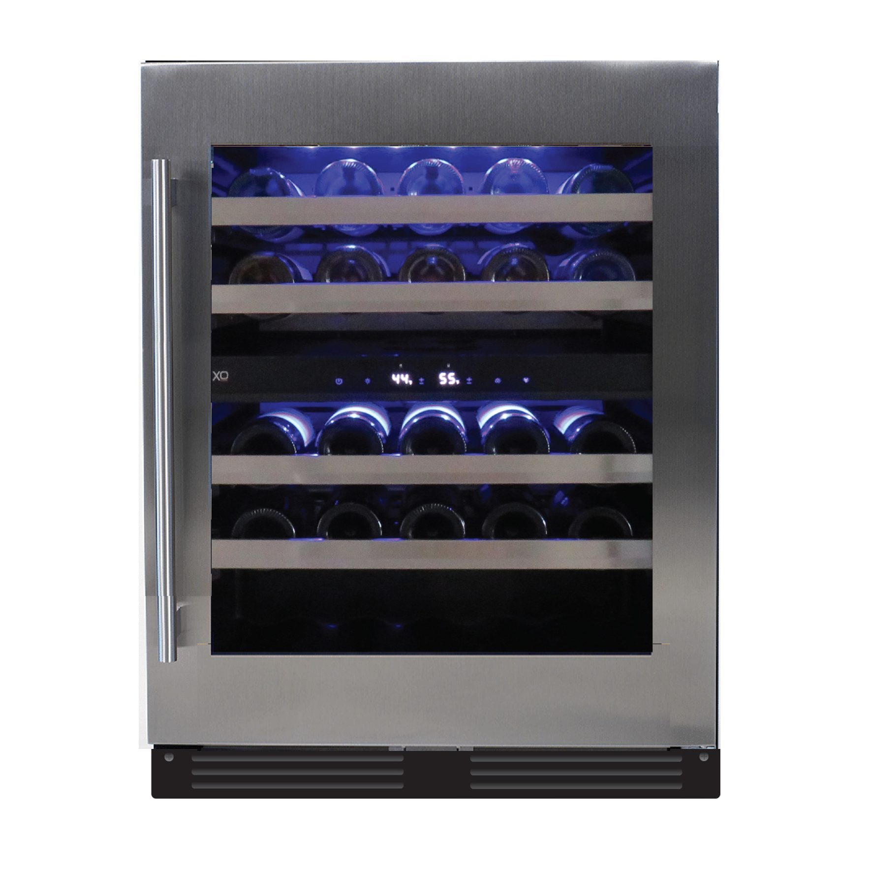 Red and white wines require different environments. XO’s Dual Zone wine cooler enables you to store and serve your favorite vintages from the same cabinet at just the right temperature. The upper racks will hold up to 16 bottles chilled between 41′ to 50′ F while the lower zone will hold up to another 30 bottles between 50′ and 64′ F.